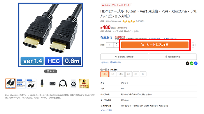 商品ページの「カートに入れる」→「ご注文手続きへ進む」をクリック。