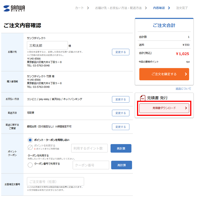 注文内容確認画面内の 「見積書ダウンロード」 をクリックしてください。
